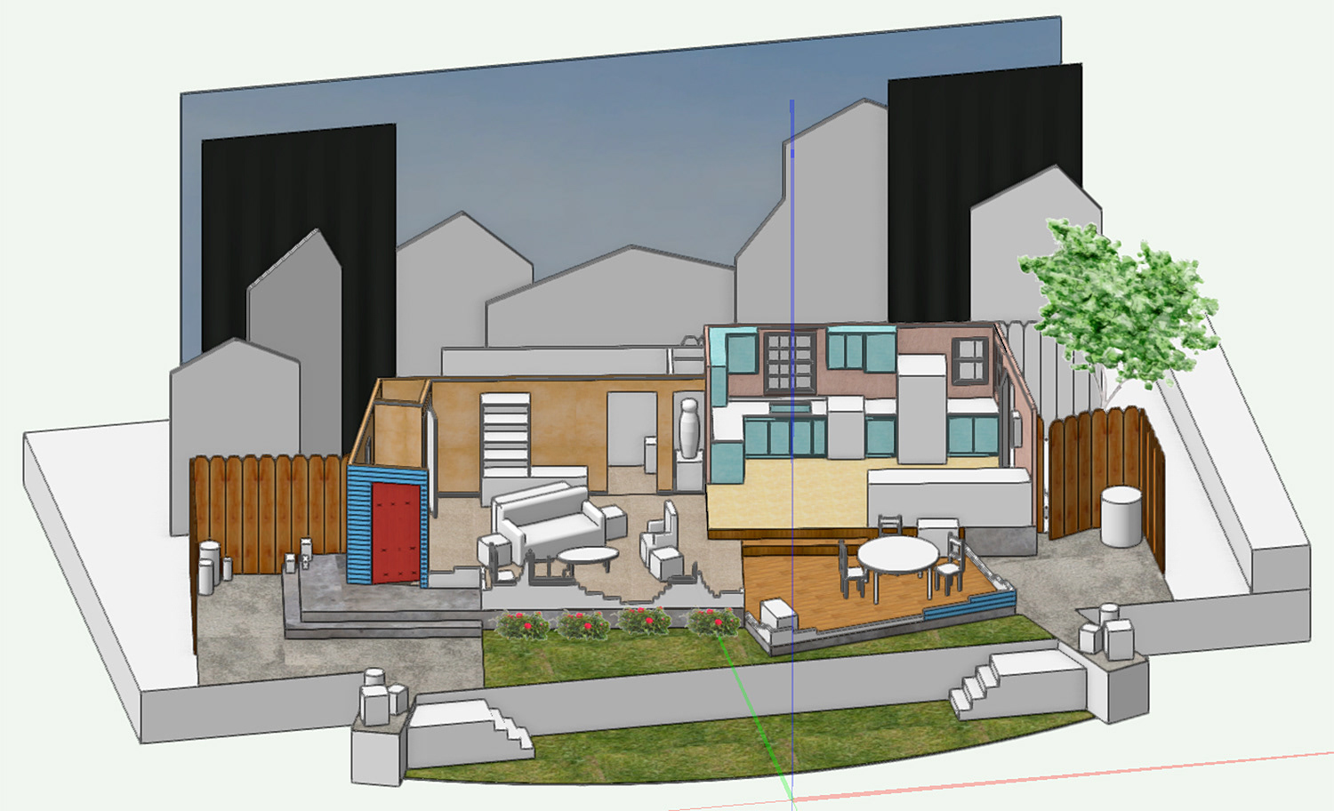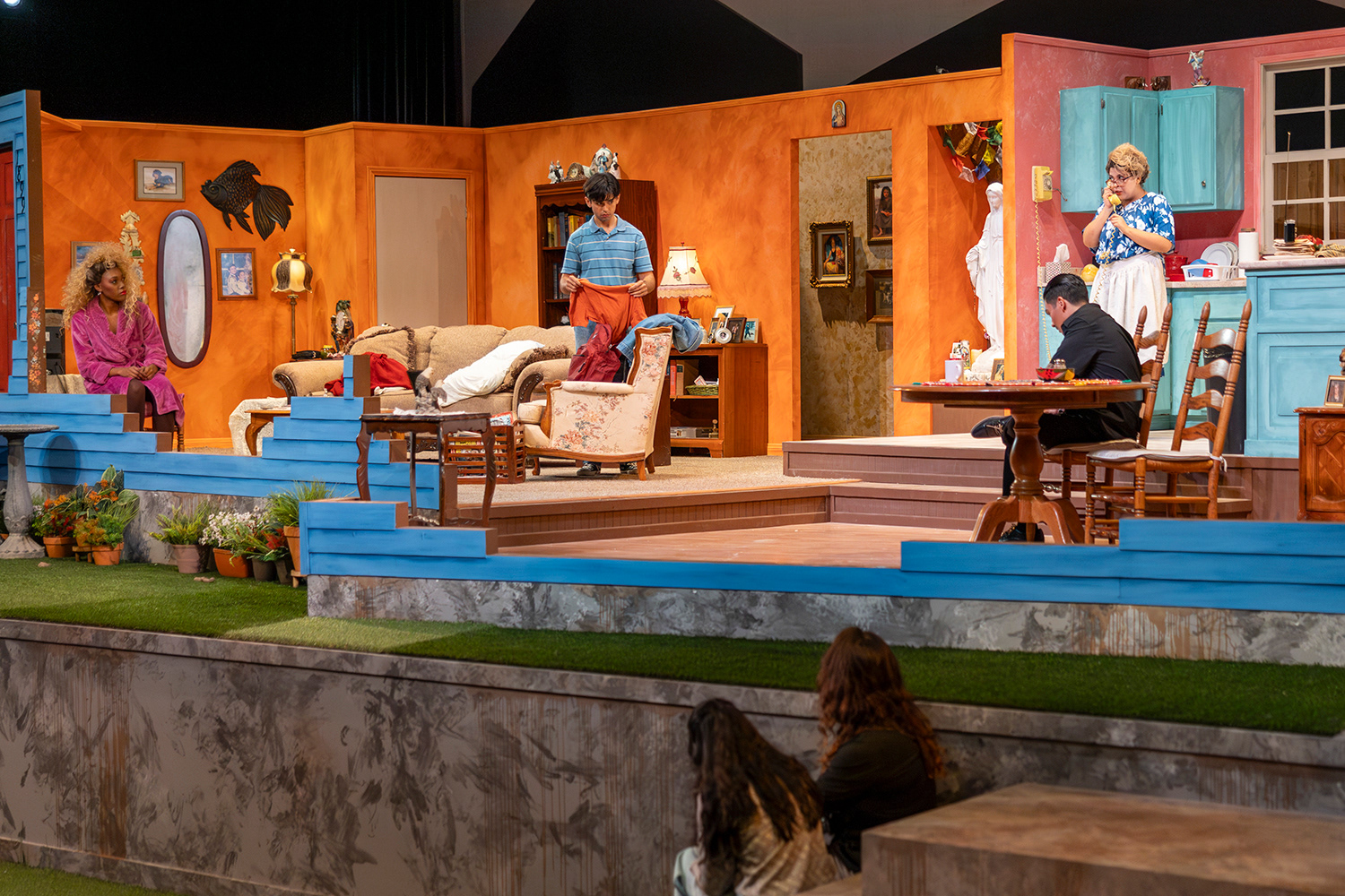 scenic design (as well as technical direction) for Moorpark College's theatrical production of Our Lady of the Tortilla - production photos and a Vectorworks initial render