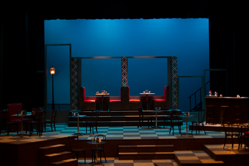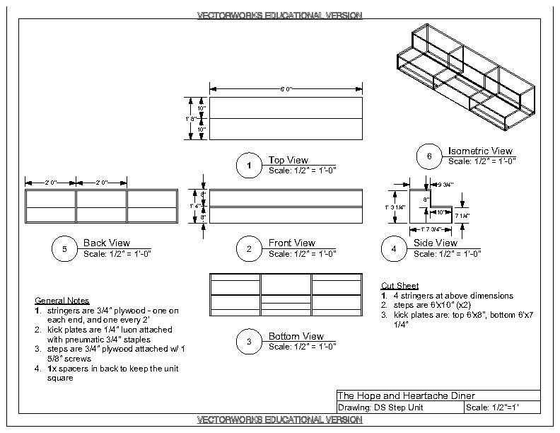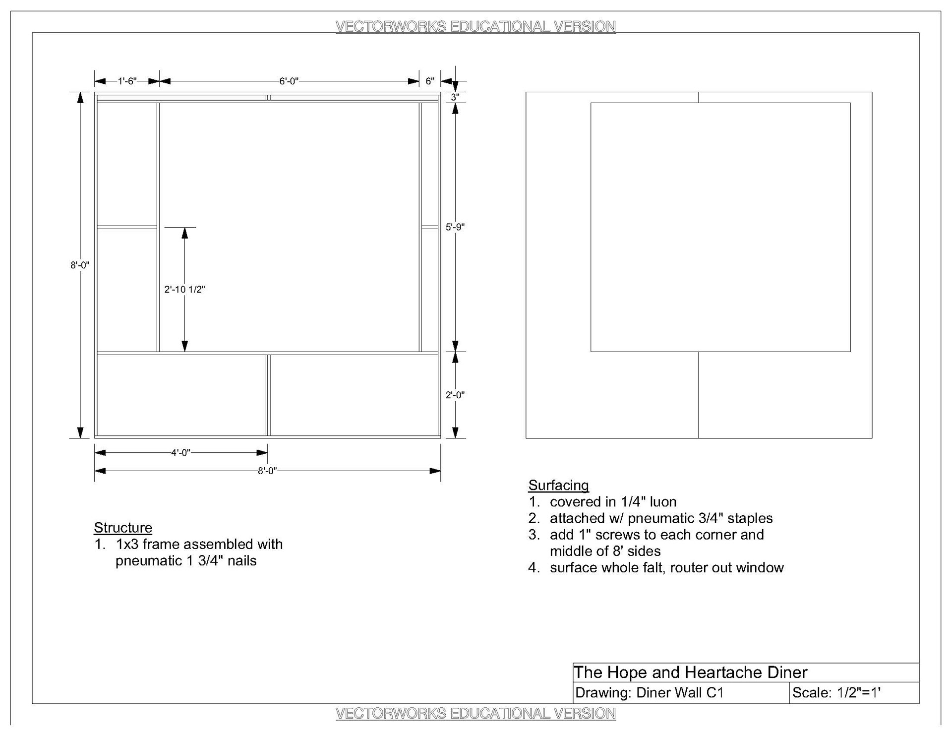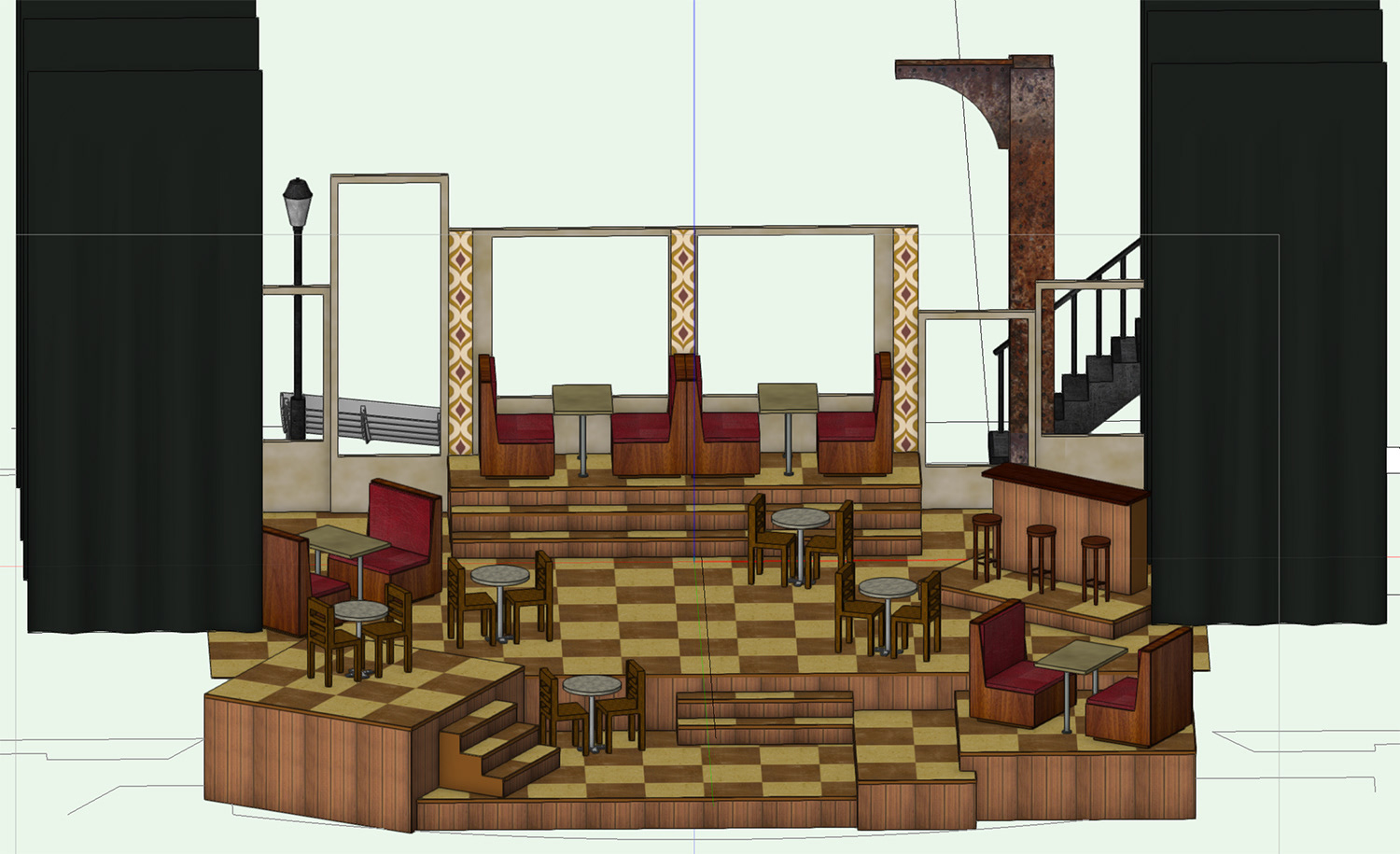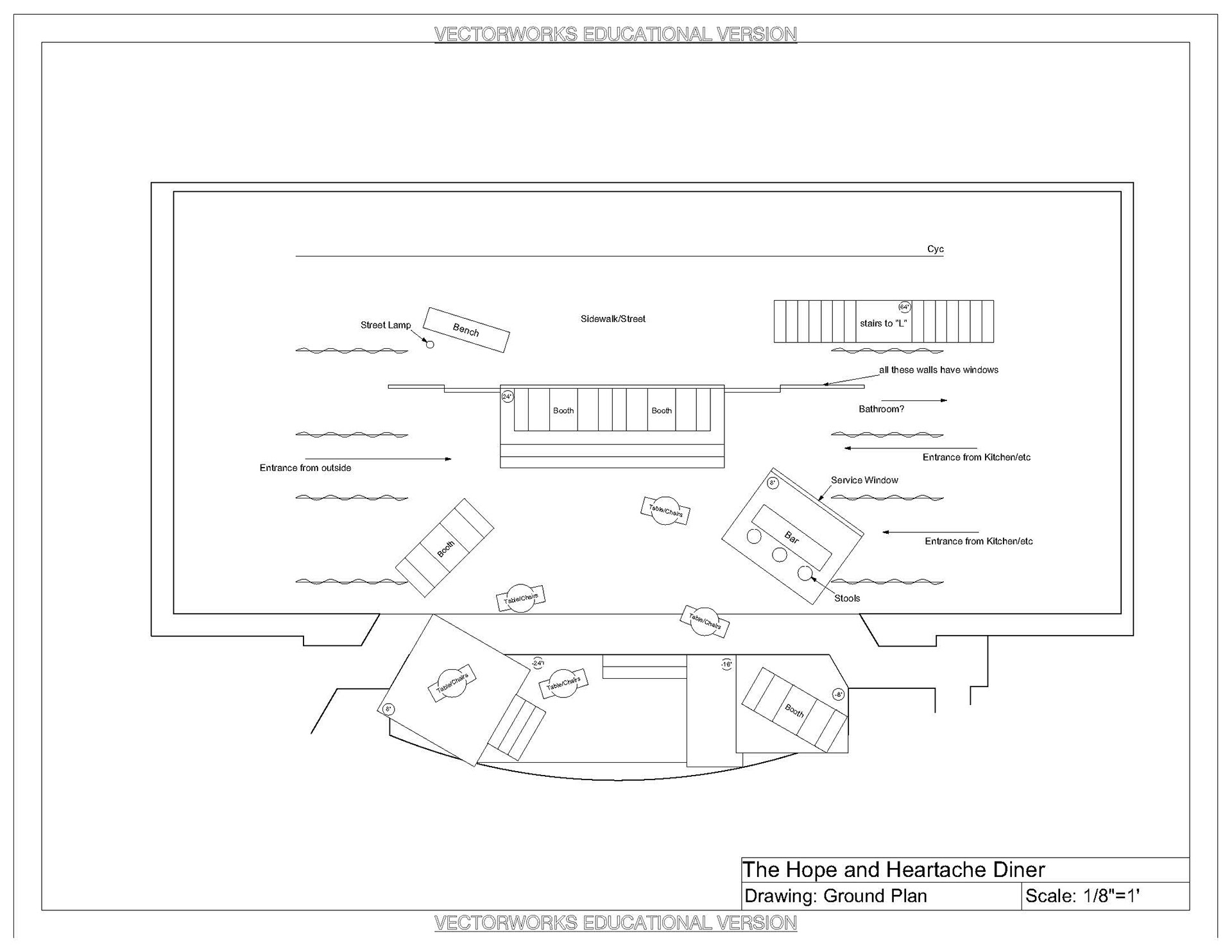 scenic design for Thousand Oaks High School's theatrical production of The Hope and Heartache Diner - rendering and draft samples done in Vectorworks
